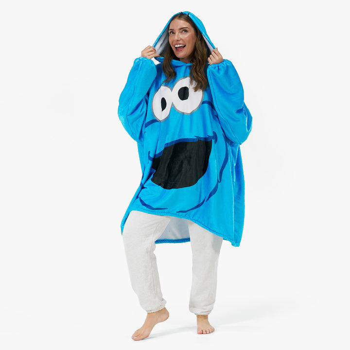 Sesame Street Cookie Monster Unisex Adult Hoodie Blanket, Blue, Oversized Hooded Sweatshirt, One Size Fits All– Big Bertha Original UK